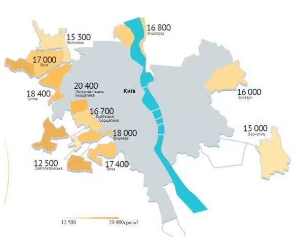 При віддаленості в п’ять кілометрів від столиці вартість квадратного метра складає в середньому 17 900 гривень. Якщо відстань становить від п’яти до десяти кілометрів, то заплатити за квадратний метр доведеться вже 17 800 гривень. Коли відстань від столиці становить від десяти до двадцяти кілометрів, ціна квадратного метра житла в новобудові в середньому коливається на позначці в 15 600 гривень.