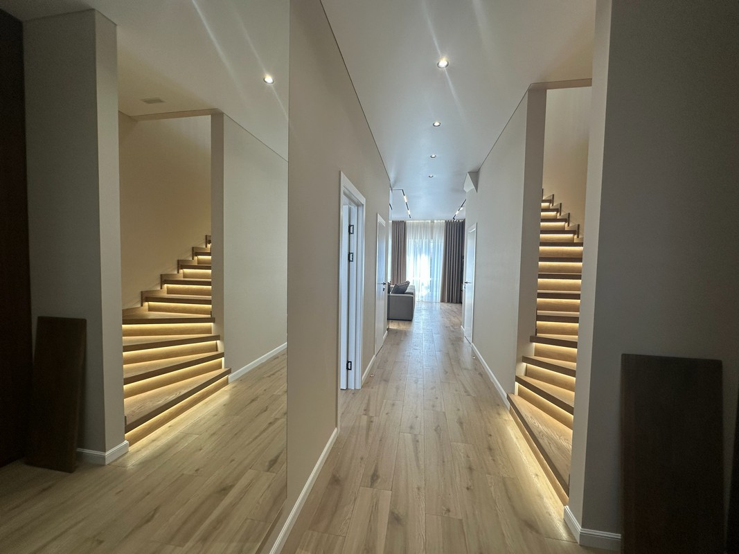 Структура дуплекса включає 4 кімнати, просторі кухню-вітальню, гардеробну та три санвузли, що дозволяє зручно розмістити велику родину. Завдяки теплої водяної підлозі в усіх кімнатах, ви зможете насолоджуватися комфортом протягом усього року. На території є парковка для автомобілів, а автоматичні ворота забезпечують додаткову безпеку.