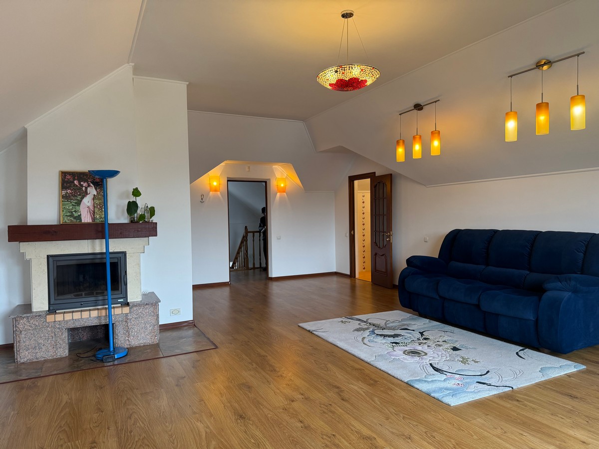 На трьох поверхах є все необхідне для комфортного проживання, кухня-вітальня-їдальня, кабінет, камінний зал, гардеробні, 4 спальні, 4 санвузли, підсобні приміщення.
