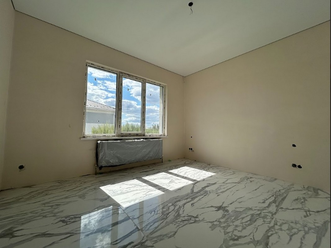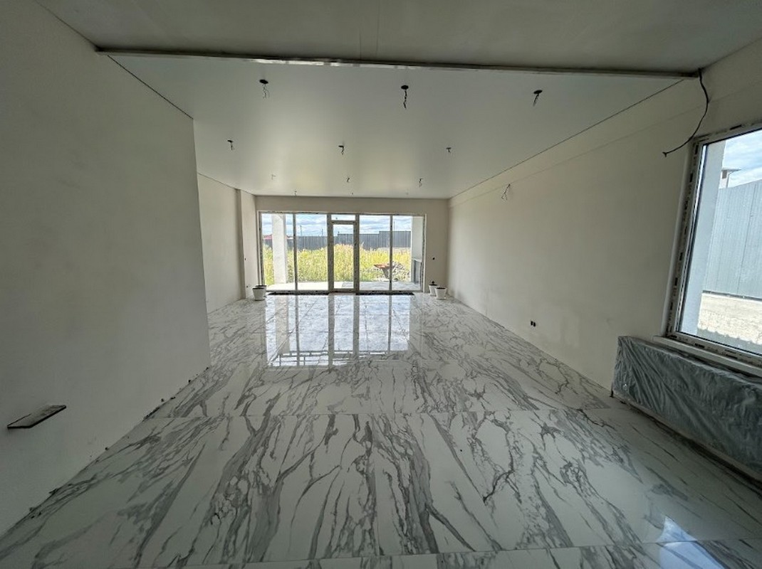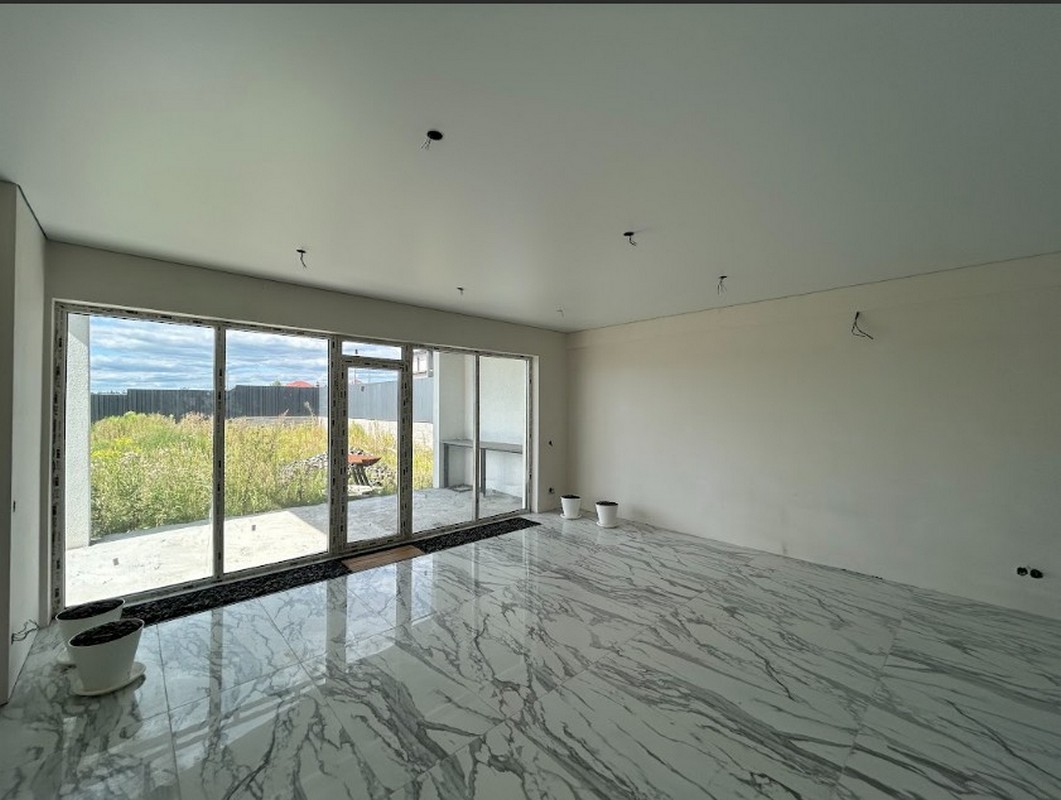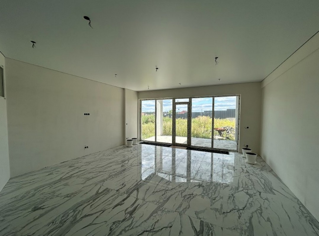 Проведена тепла підлога по всьому будинку. Встановлені внутрішньо підлогові конвектори, установлена натяжня стеля, стіни готові під фарбування. По полу укладена широкоформатна плитка.
