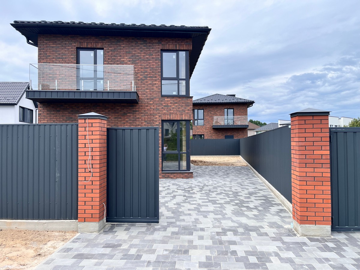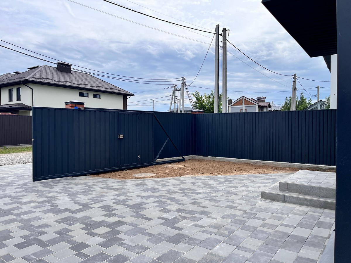 Ділянка огороджена забором, встановлені відкатні ворота. Викладена тротуарна плитка.