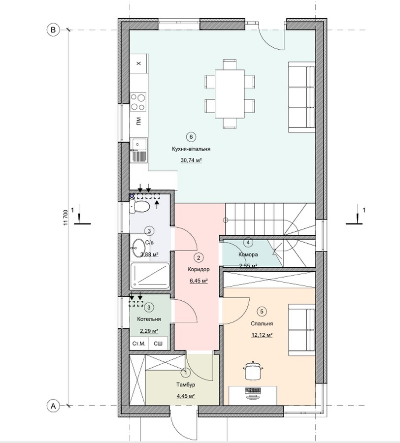 В будинку є простора кухня-вітальня, 4 окремих кімнати, 2 санвузли, котельня.