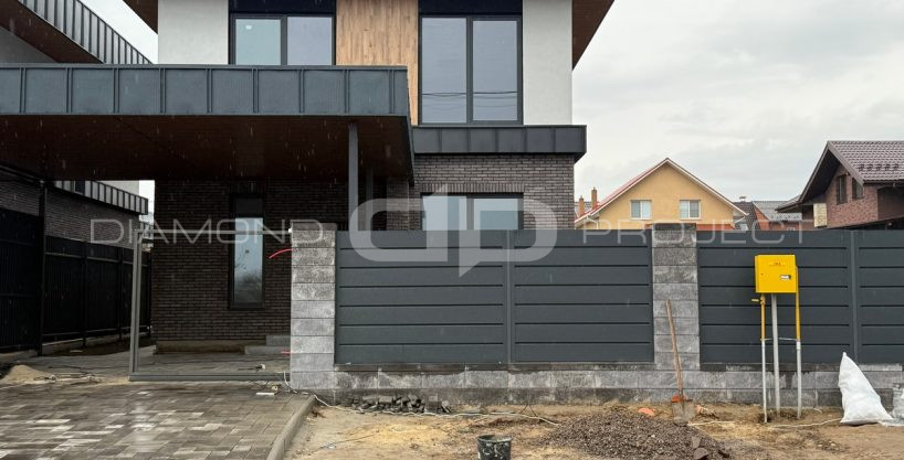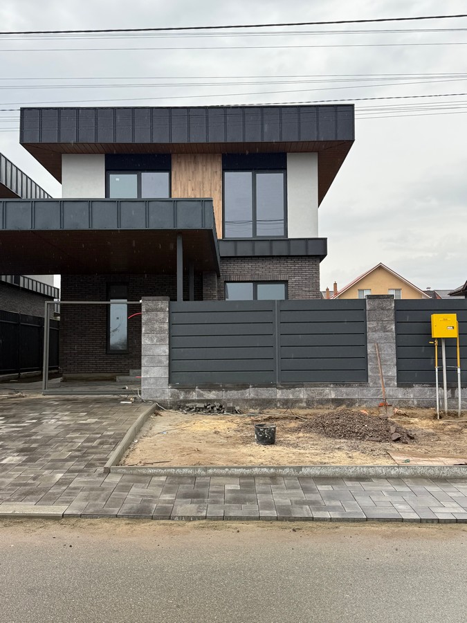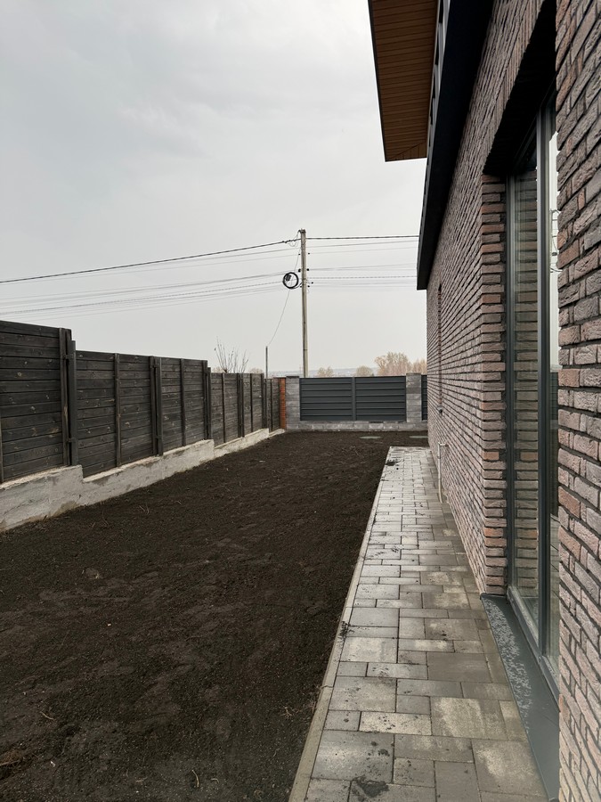 Під’їзд до ділянки – асфальт; на ділянці: відмостка та парковка на 2 авто – бруківка |