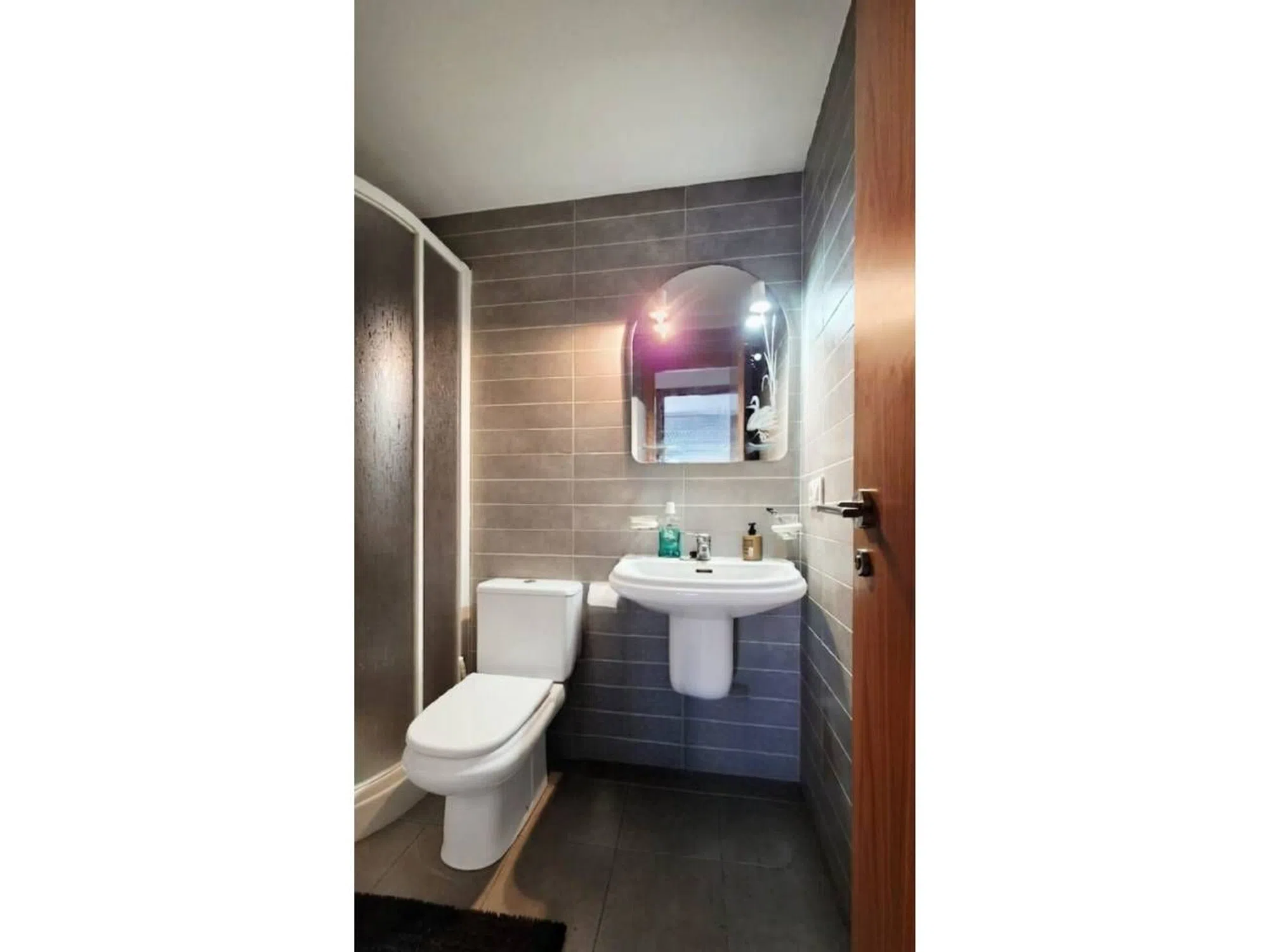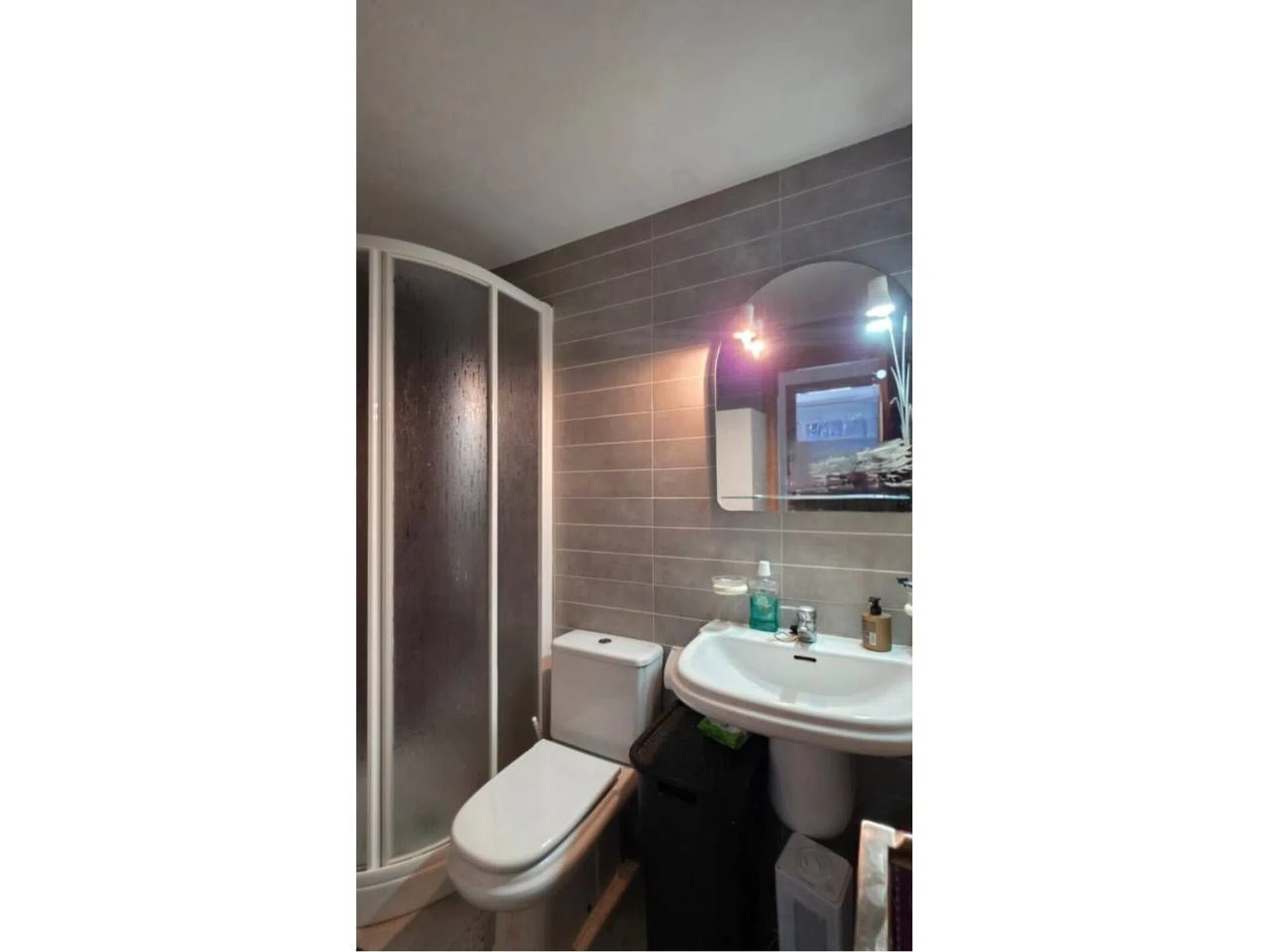 У квартирі також є повноцінна ванна кімната з душем і вигнутою скляною перегородкою, яка дозволяє ефективно використовувати простір.