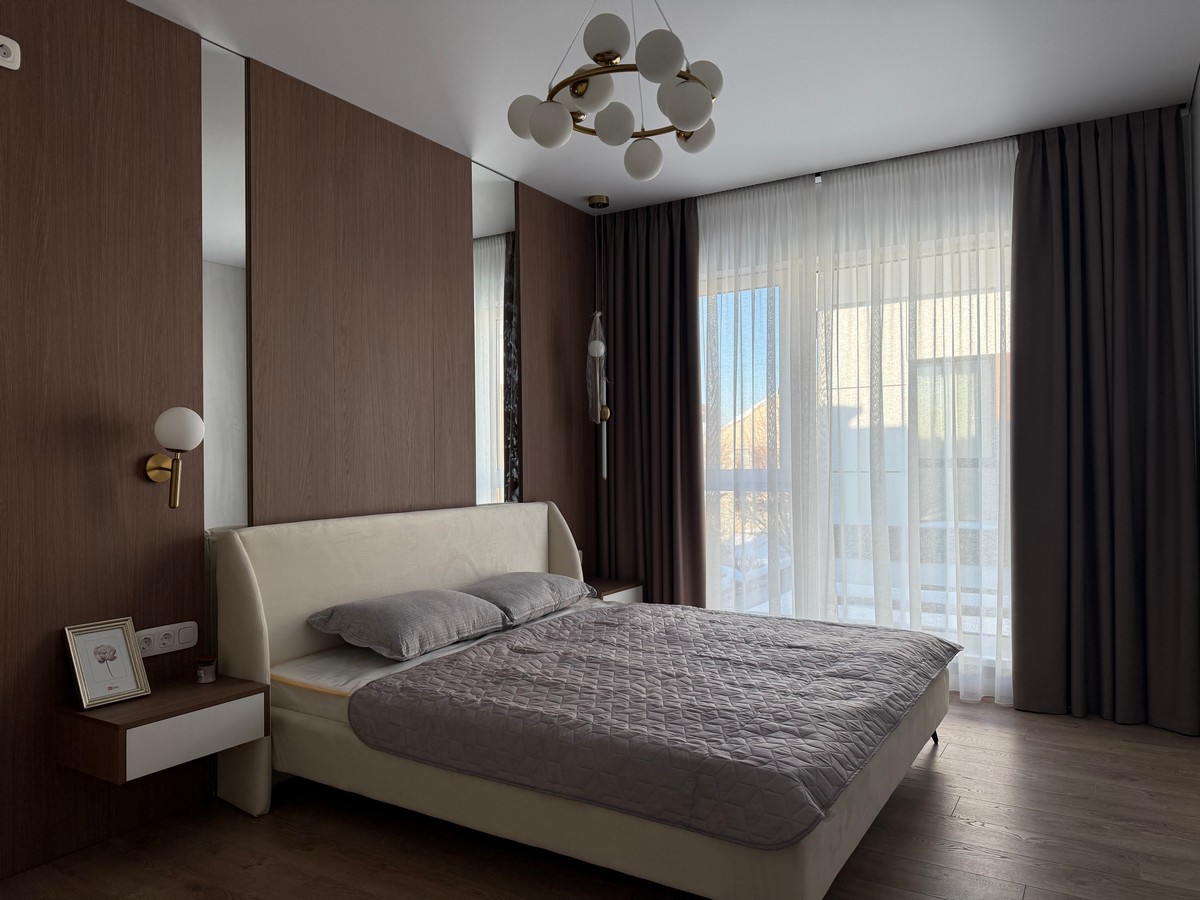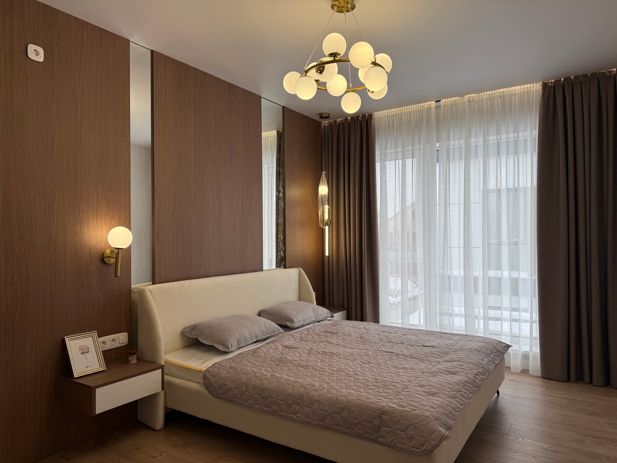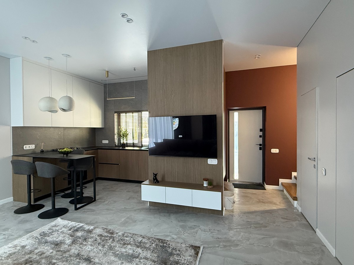 Будинок має кухню-вітальню, 4 окремі кімнати, 2 санвузли та гардеробну.